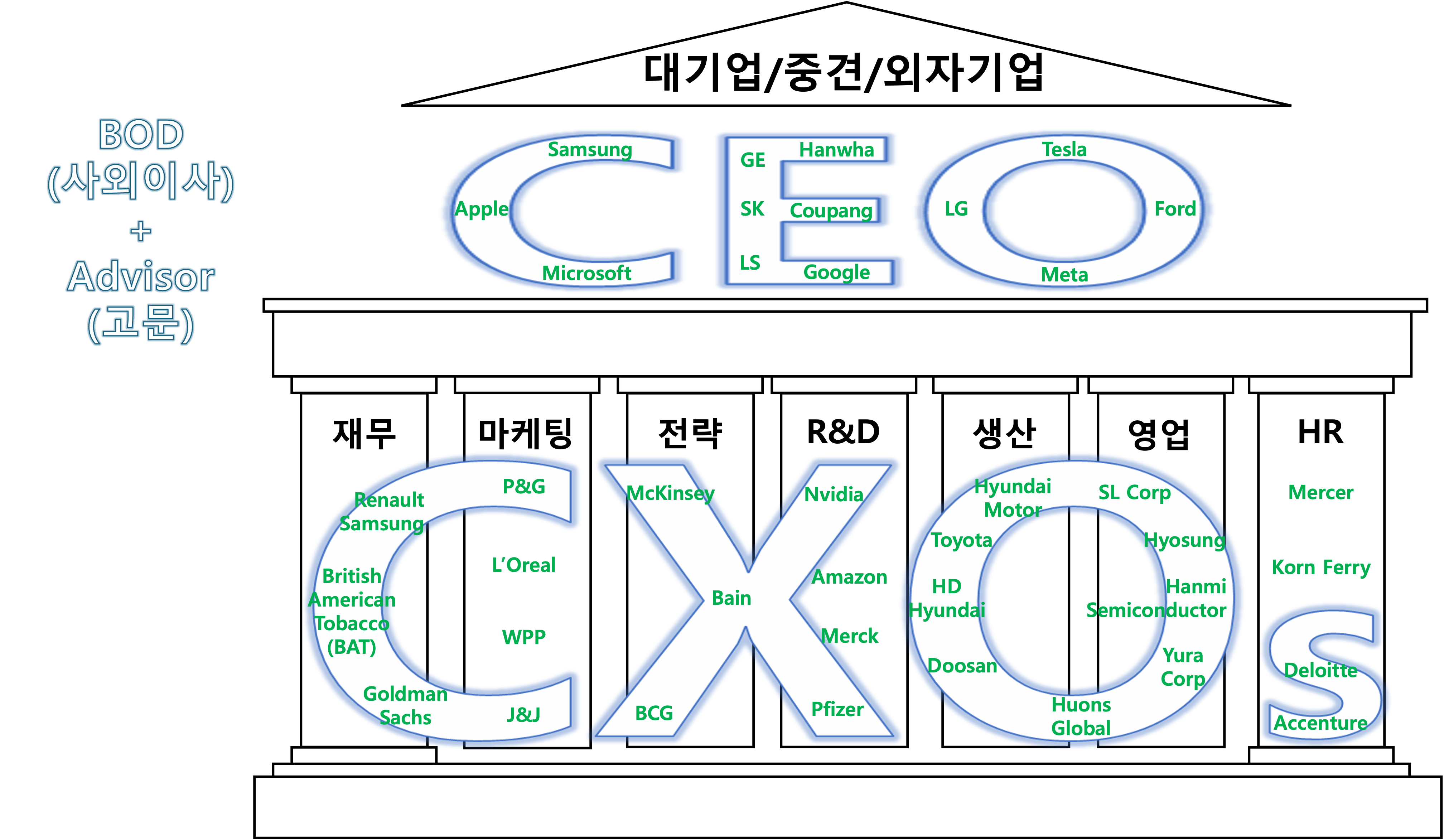 글로벌 외자기업은 대기업 본사 경험을 갖고 있는 인재가 필요할 수 있고, 국내 중견기업은 글로벌 기업과 대기업 출신 임원이 필요할 수 있으며 대기업은 해외 경험이 풍부한 글로벌 외자기업 출신 임원이 필요할 수 있습니다.